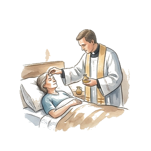 Through this holy anointing may the Lord in his love and mercy help you with the grace of the Holy Spirit. May the Lord who frees you from sin save you and raise you up.